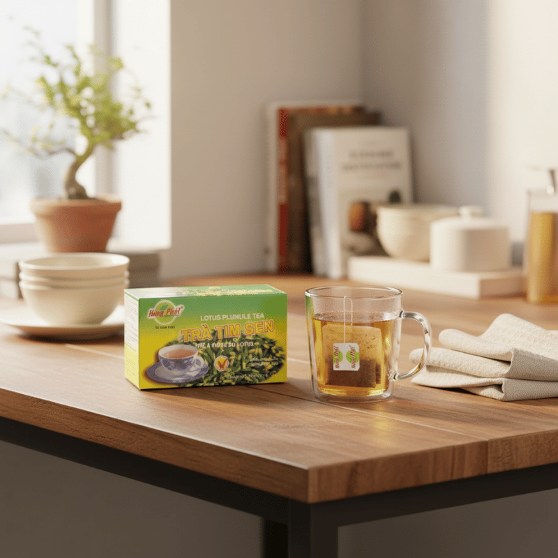 Khi rót nước nóng vào túi Trà Tim Sen Hùng Phát, điều dễ nhận ra là màu nước vàng nhạt, trong và dịu mắt. Màu trà không sẫm, không đậm, tạo cảm giác nhẹ nhàng ngay từ cái nhìn đầu tiên. Cùng lúc đó, hương thơm tim sen hòa cùng hương thơm thảo mộc lan nhẹ trong không gian, không nồng, không gắt, đủ để người uống nhận ra nét đặc trưng của trà. Chính ấn tượng ban đầu này khiến nhiều người cảm thấy yên tâm khi thưởng thức. Trà không cần phô trương, chỉ cần vừa vặn để người uống cảm nhận sự thư thái rất tự nhiên.