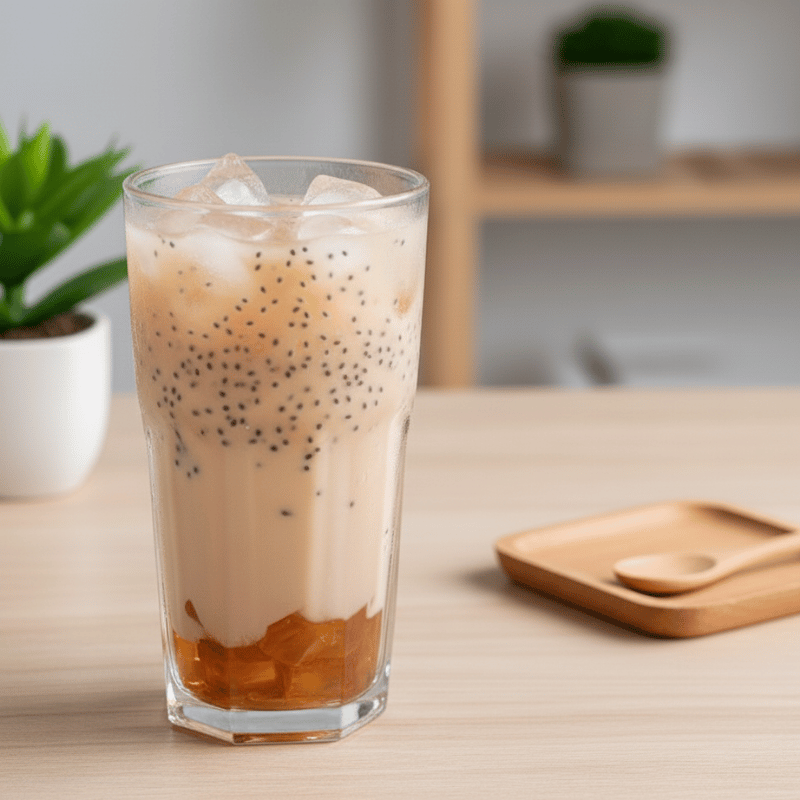 Hạt chia không làm thay đổi hương vị chính, mà chỉ bổ sung cảm giác lăn nhẹ khi uống, phù hợp với những ai thích trải nghiệm khác biệt nhưng vẫn giữ sự giản dị.