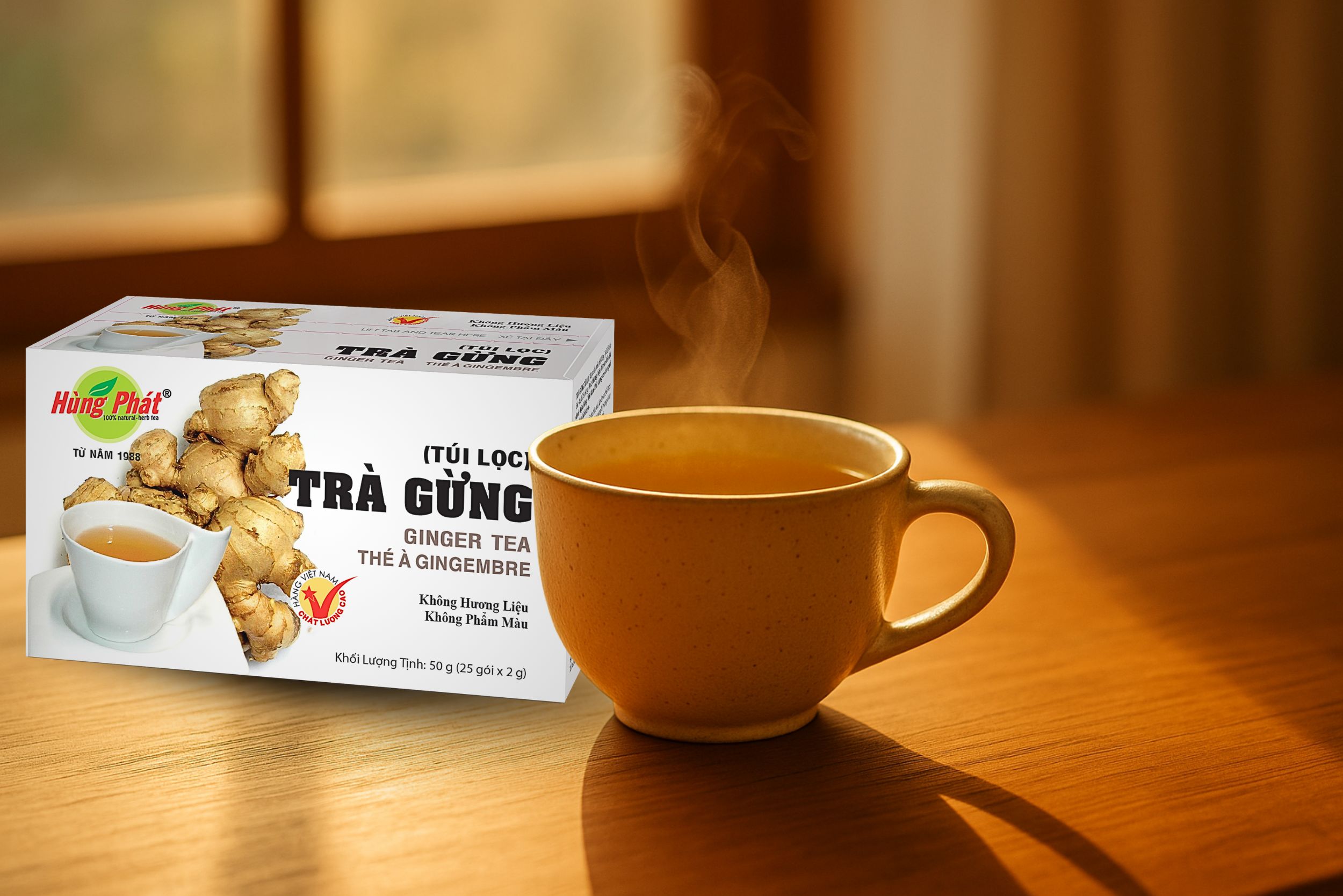 Thưởng thức Trà Gừng Túi Lọc Hùng Phát – hơi ấm từ gừng Việt, tinh hoa trà Việt Nam, cho mỗi khoảnh khắc bình an.