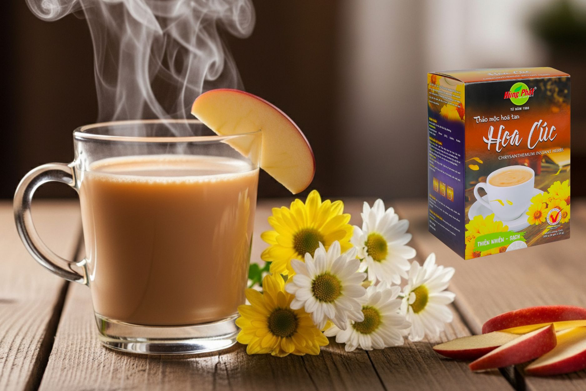 Thảo Mộc Hòa Tan Hoa Cúc Hùng Phát mang đến hương vị hoa cúc tự nhiên trong hình thức tiện lợi – phù hợp cho mọi cách pha từ đơn giản đến sáng tạo.