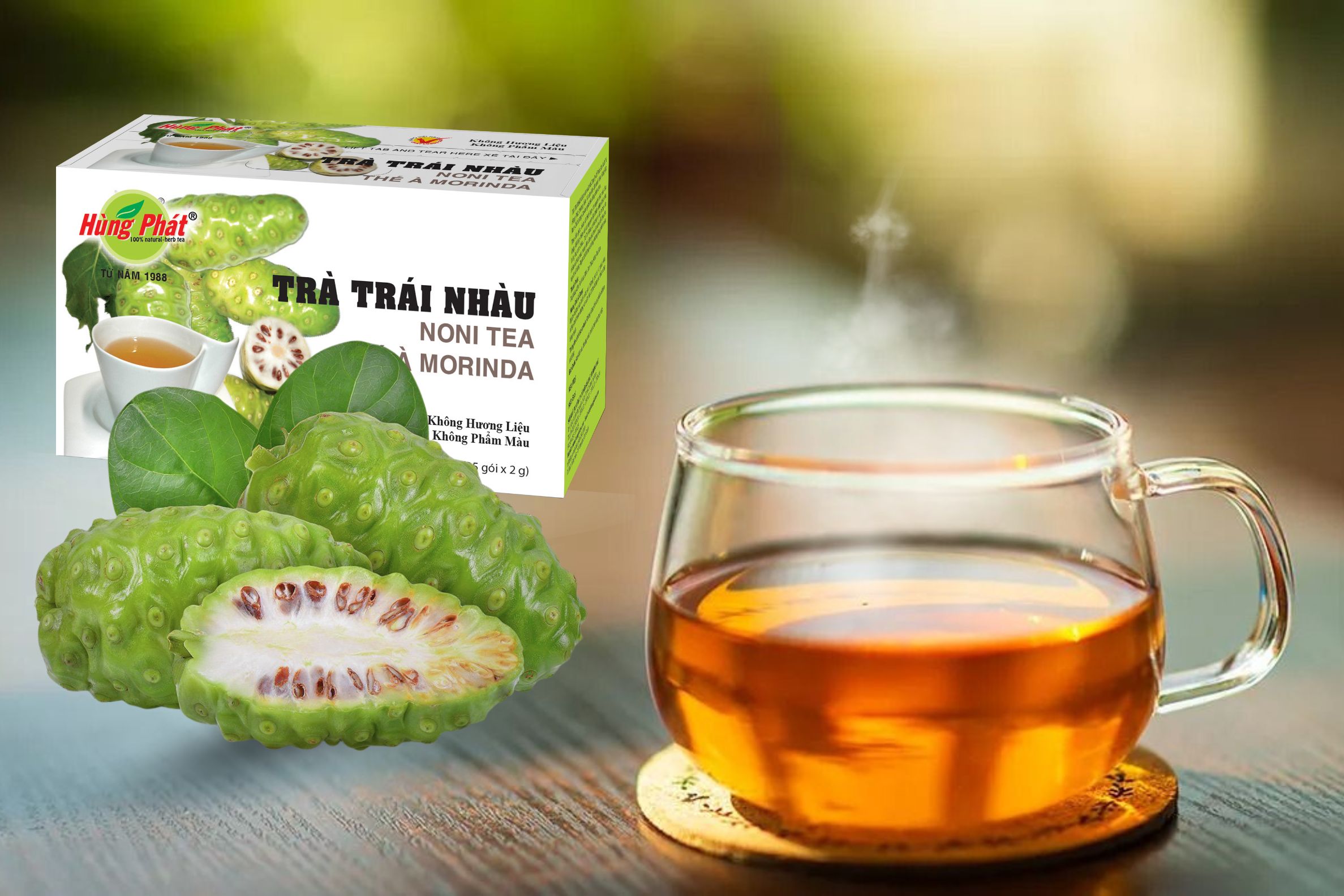 Trà Nhàu Hùng Phát là sự kết hợp của trái nhàu, rễ nhàu cùng các loại thảo mộc tự nhiên như hồng trà, cam thảo và nhân sâm.
