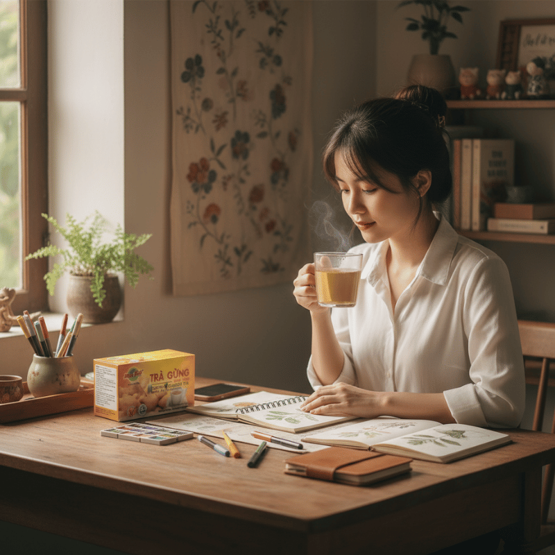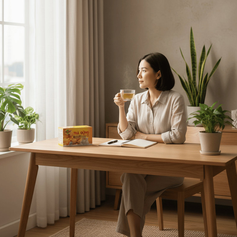 Một ngày làm việc dài thường đi kèm với nhiều thay đổi và áp lực. Giữa những cuộc họp, email và lịch trình liên tục, việc giữ lại một thói quen quen thuộc giúp nhiều người cảm thấy ổn định hơn. Trà gừng, với hình ảnh gắn bó từ lâu trong đời sống, mang lại cảm giác quen thuộc ấy. Việc uống một ly trà gừng trong ngày làm việc không nhằm tạo ra sự khác biệt, mà đơn giản là để giữ nhịp sinh hoạt ở mức cân bằng. Chính sự giản dị này khiến trà gừng dễ gắn bó với người đi làm trong thời gian dài.