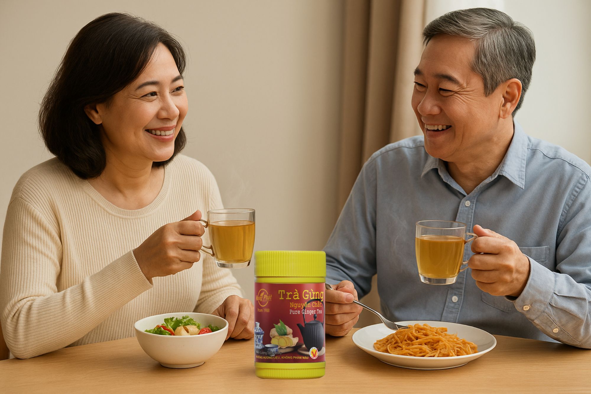 Từ lâu, người Việt vẫn có thói quen thưởng trà sau bữa ăn như một cách cân bằng và tận hưởng. Giữa hương vị đậm đà của món ăn, vị gừng dịu ấm xuất hiện như nốt nhạc cuối cùng – giúp khép lại bữa cơm trọn vẹn, thân tâm đều thấy dễ chịu.