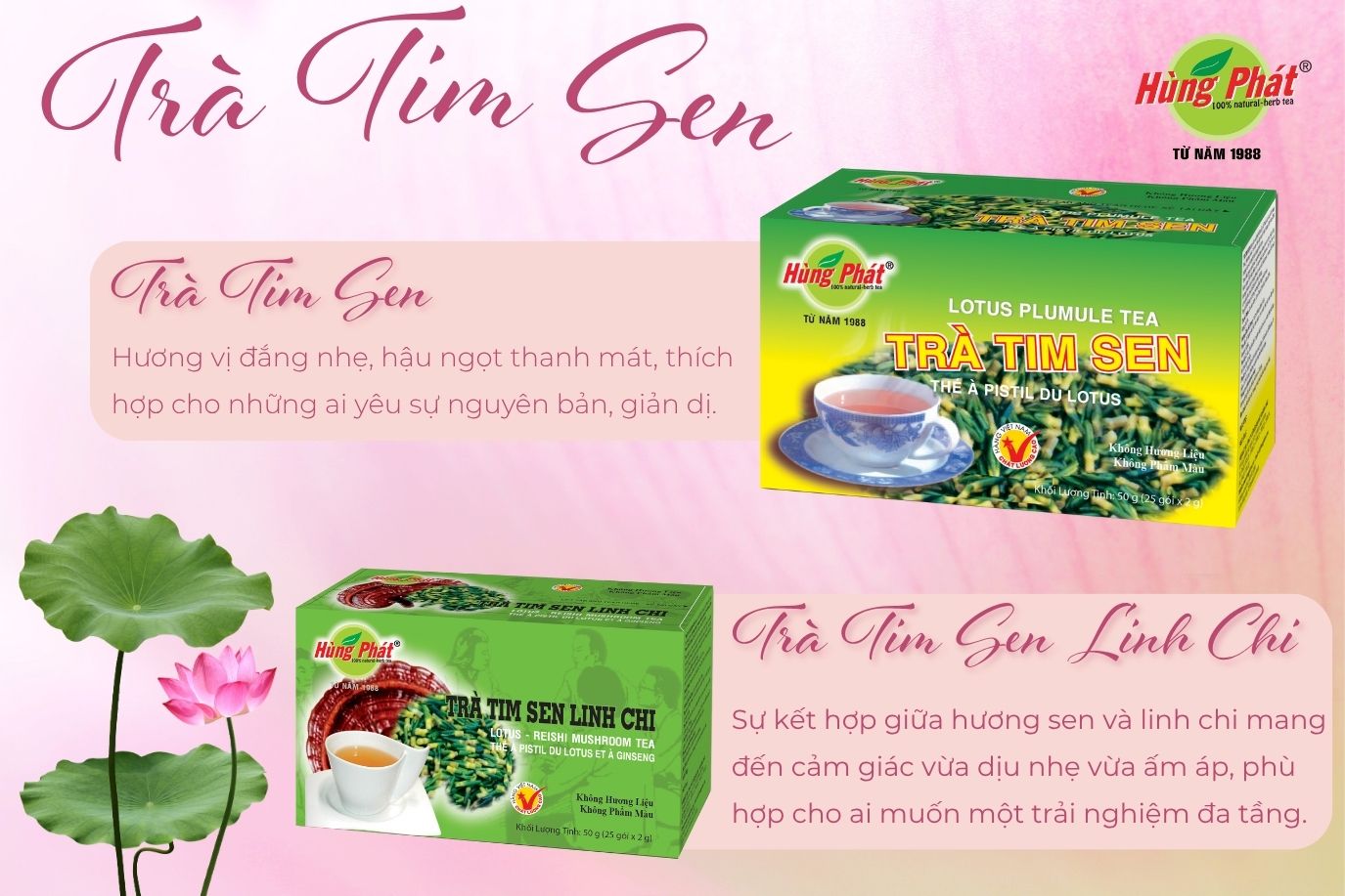 Trà Tim Sen nguyên chất được làm từ 100% tim sen, không thêm hương liệu hay phẩm màu. Trong khi đó, Trà Tim Sen Linh Chi kết hợp tim sen cùng linh chi và một số thảo mộc bổ trợ, mang lại sự cân bằng cả về hương vị lẫn trải nghiệm. Điểm chung của cả hai là sự an toàn, minh bạch, đúng với cam kết của Hùng Phát trong suốt 37 năm: chỉ mang đến sản phẩm thật, chất lượng thật.