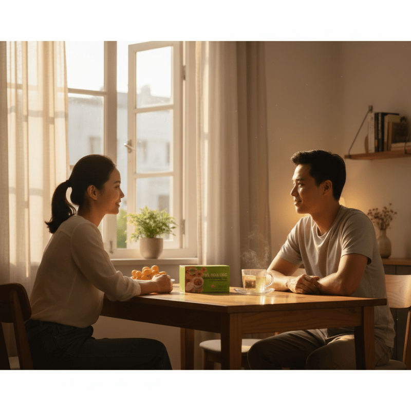Không chỉ dừng lại ở trải nghiệm cá nhân, trà hoa cúc còn gắn liền với sinh hoạt gia đình. Trong nhiều gia đình, việc uống trà buổi tối là một thói quen được duy trì đều đặn. Đó có thể là lúc mọi người cùng nhau trò chuyện, chia sẻ những câu chuyện trong ngày. Trà hoa cúc, với cảm giác nhẹ nhàng khi thưởng thức, phù hợp để xuất hiện trong những khoảnh khắc như vậy. Trà Hoa Cúc Hùng Phát đóng vai trò như một phần của không gian chung, không chiếm trọn sự chú ý, nhưng đủ để tạo nên cảm giác gần gũi và thoải mái.